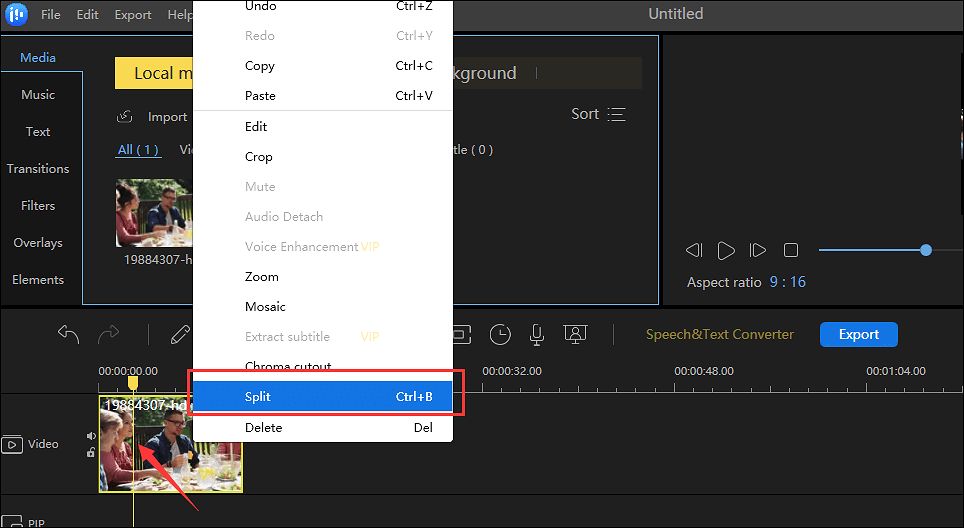 Step 3.Move the cursor and place it where you want to split the video. Right-click the video and select the "Split" option or press Ctrl + B to divide the video into two parts.